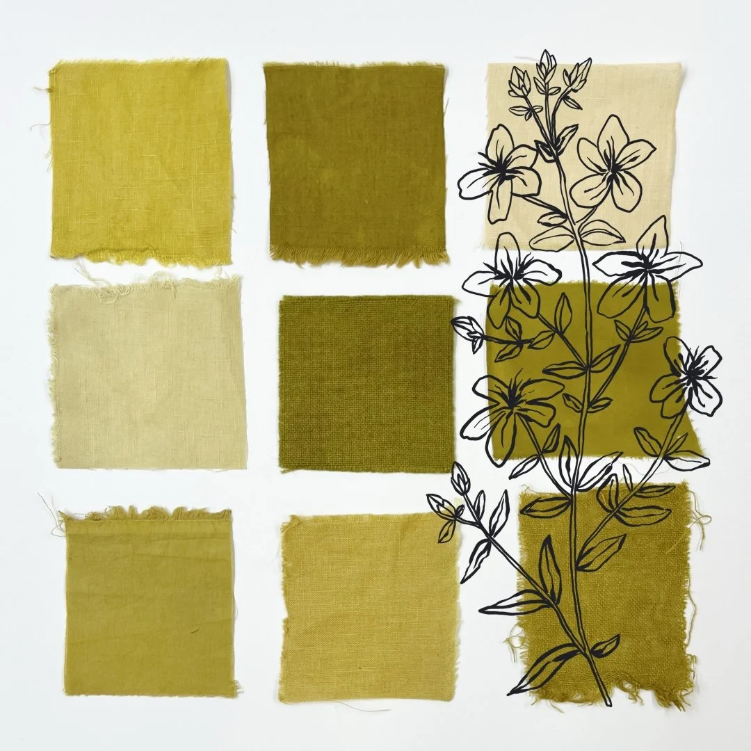 St. John’s Wort is one of my favorite plants. I usually start to notice the little yellow blooms as early as the first week of June. It's in bloom around the Summer Solstice. This marks the beginning of the season for gathering an abundance of dye plants from my surrounding landscape. Solstice Wort can be found in most places throughout the world and has a long history as a medicinal and magickal plant. If you pinch the bright yellow flowers between your fingers, they leave a purplish-red mark. I generally use the stems and leaves, saving most of the flowers for medicinal purposes, but always include some in the dye bath. Colors range from vibrant greens to olives. As the dye bath ages and becomes exhausted, the colors shift to golden yellows. If possible, gather it on the Summer Solstice and use it to create a dye bath to infuse fabric, thread, or yarn for use in the coming months, whenever you need to invite sunshine and warmth into your life.