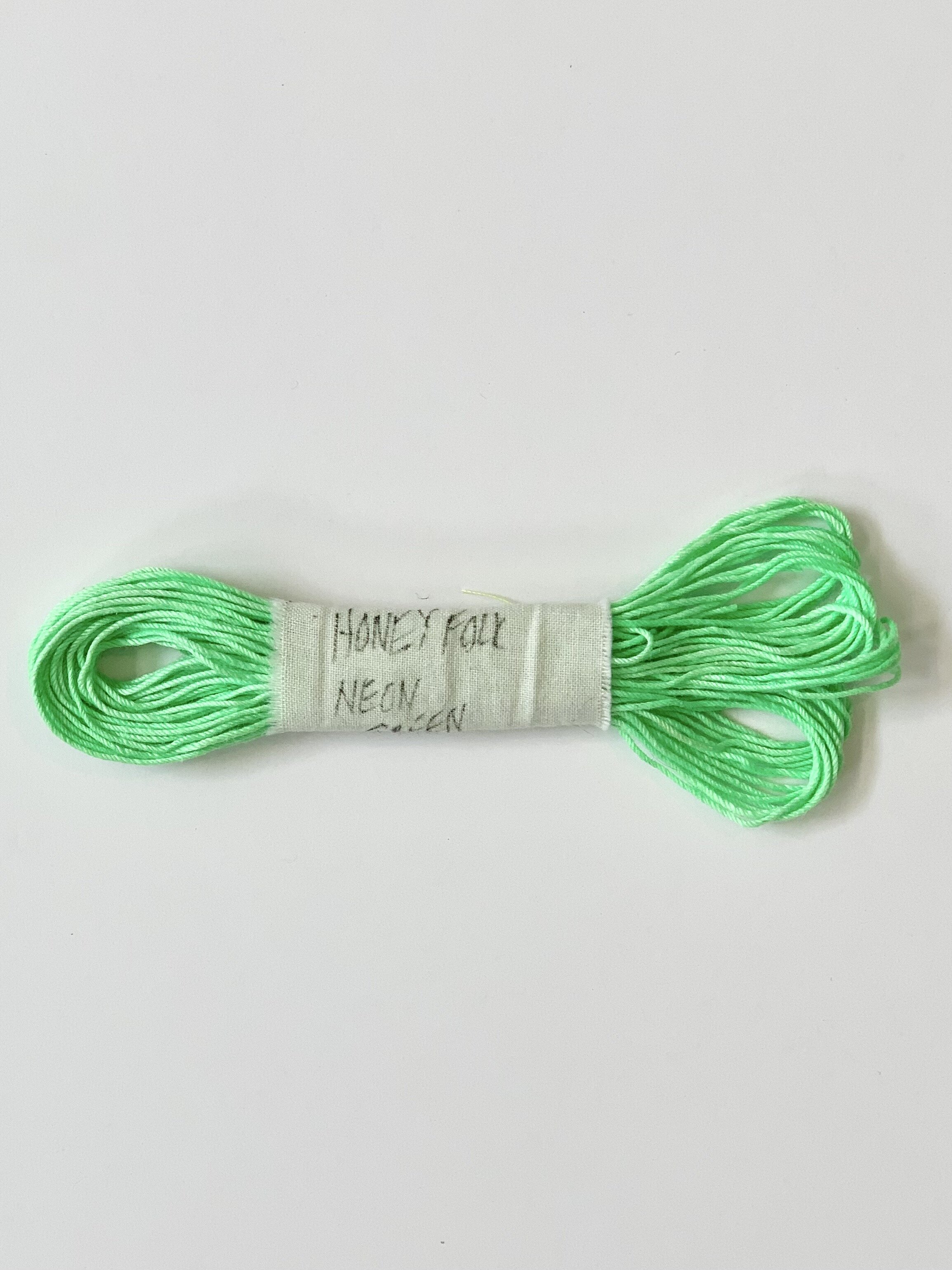 Hand-dyed sashiko thread made in Sonoma County, California. Honey Folk neon thread is hand-dyed using a non-toxic water-based pigment. This thread is a lovely choice for visible mending, boro stitching, sashiko, hand-embroidery, cross-stitch, tassels, pom-pons, gift wrapping, & more!